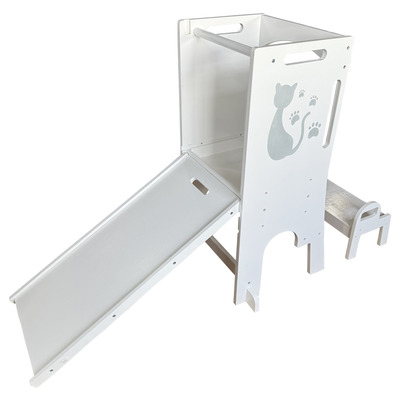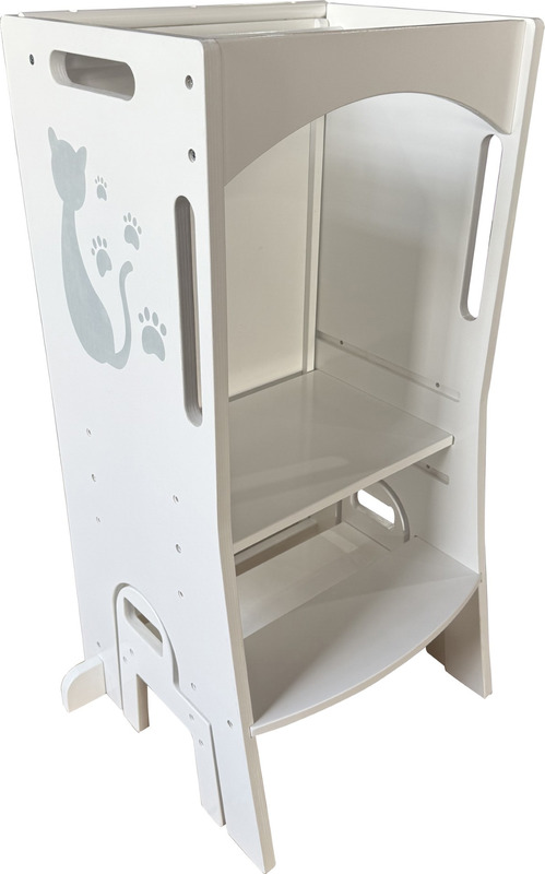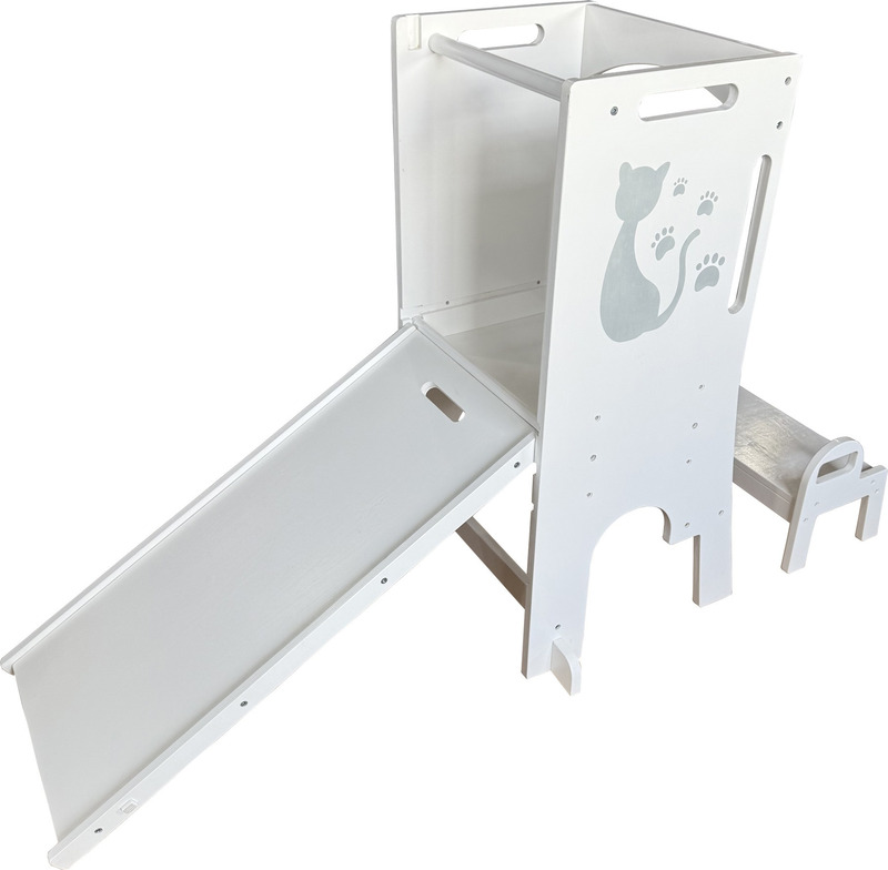 Umožňuje najmenším byť v úrovni pracovnej dosky, vidieť všetko, čo robíte a tvoriť tak priamo s Vami – vďaka tomu máte aj neustály dozor. Veža sa skladá zo stojacej plochy, na ktorej dieťa stojí, schodíka, po ktorom sa na ňu dostane az ohrádky okolo. Vďaka svojej multifunkčnosti sa dá s vežou aj „hrať“. Obsahuje magnetickú tabuľku s písmenami a číslicami av rozloženom stave je doplnená o šmýkačku. Pri používaní nenechávajte učiacu vežu v priestore, ale vždy vežu umiestnite stranou oproti schodíku k pevnej prekážke (kuchynská linka a pod.).