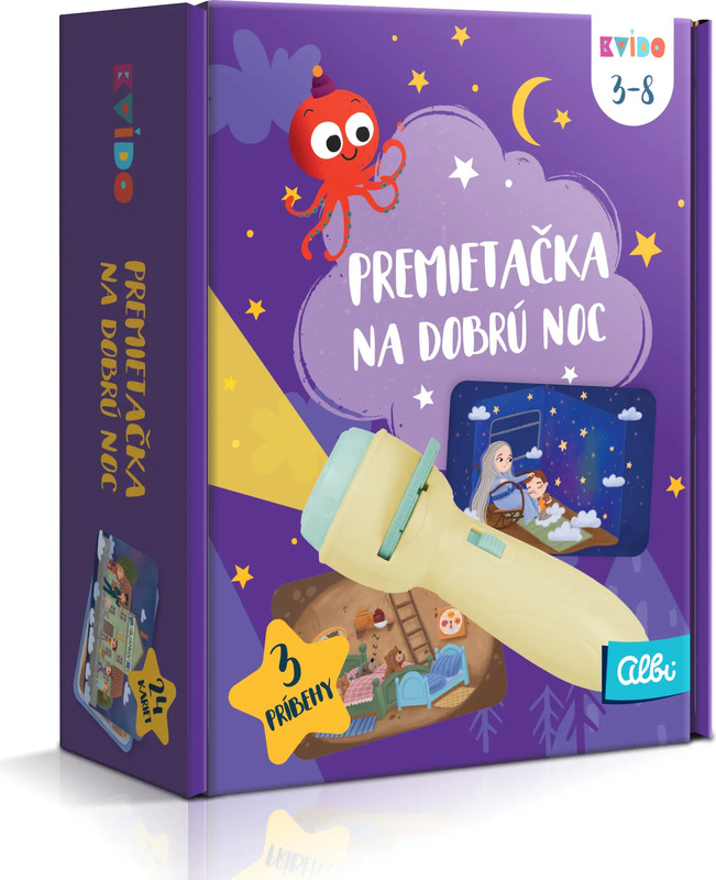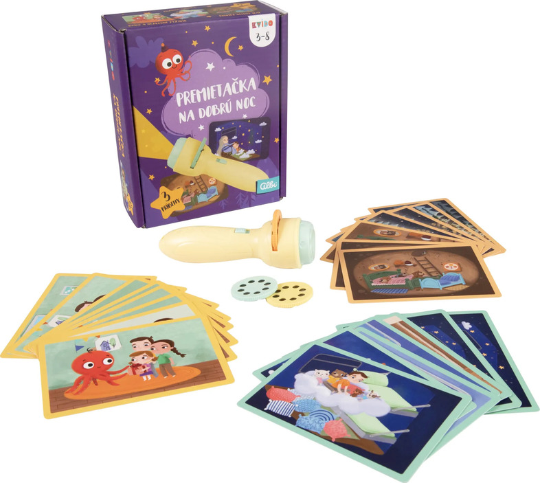 Obsah balenia: premietačka, 3 disky na nočné premietanie, na každom disku je 1 rozprávka, 24 obrázkových kariet s textami 3 rozprávok.