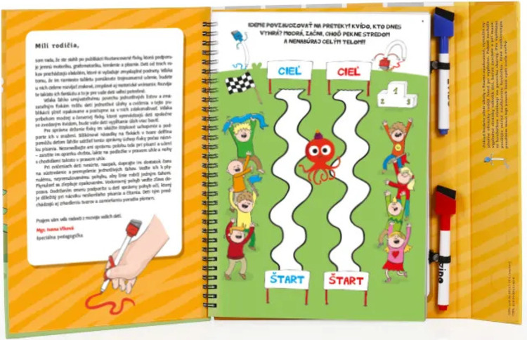 - Súčasťou publikácie sú aj 2 zmazateľné fixky s hubkou – červená a modrá, vďaka ktorým môžu deti úlohy plniť opakovane a zdokonaľovať sa v nich. Na fixkách sú silikónové násadky v tvare delfína, ktoré podporujú správne uchopenie fixky počas písania.