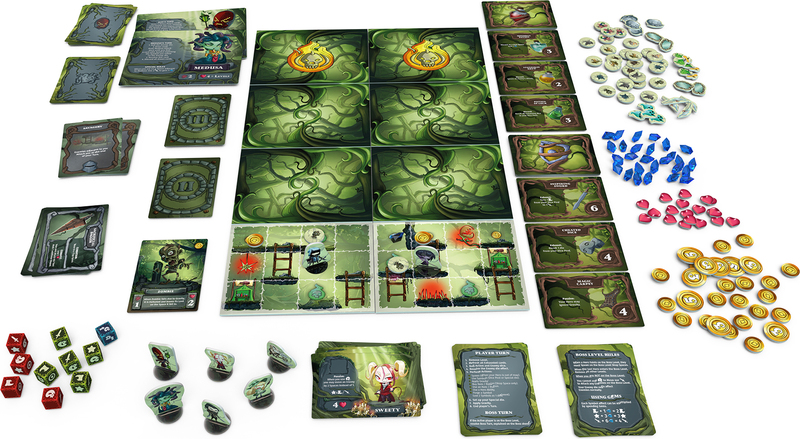 Hra Plošinovka obsahuje: 6 kariet hrdinov, 6 kariet nepriateľov, 15 kariet predmetov, 15 kariet elixírov, 11 kariet bossovho útoku, 30 ďalších kariet, 32 kariet kobky, 8 plastových stojanov, viac ako 160 žetónov a ukazovateľov, 2 veľké karty bossov, 10 kociek.