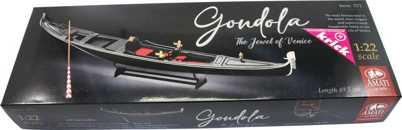 Stavebnica modelu AMATI Benátska gondoliéra 1:22 kit. Najznámejšia a najcharakteristickejšia loď benátskych lagún. Loď s plochým dnom trupu a asymetrickým tvarom predstavuje typickú gondolu, ktorá sa dodnes stavia v malých dielňach pre plavebné kanály Benátok.