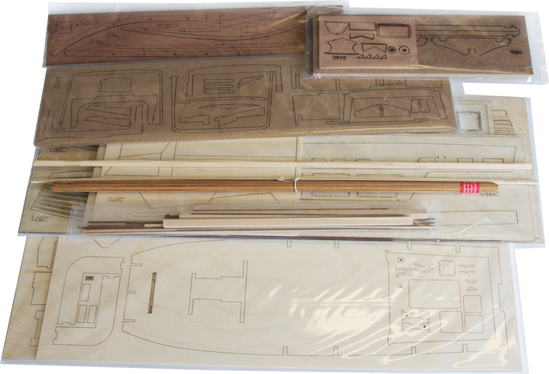 Balenie obsahuje sadu dosiek s preglejkovými dielmi, sadu nosníkov, nafarbený laminátový trup, blistre s drobnými dielmi, model člna, maketové súčasti kabíny, materiál na plachty, drôtené súčasti, papierové dekorácie, obsiahla sada výkresov, obrazový manuál.