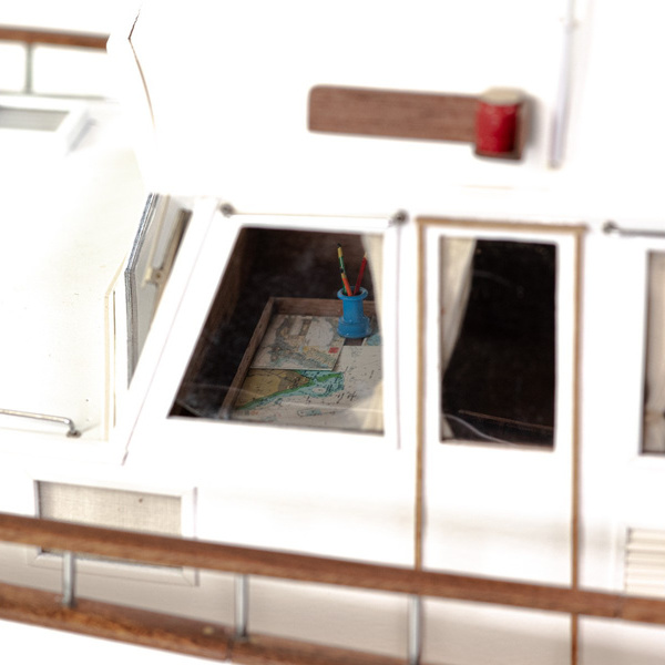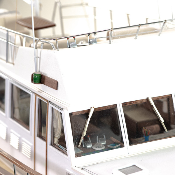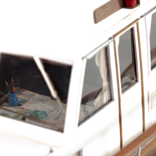 Stavebnica statickej makety lode, AMATI Grand Banks motorová jachta z roku 1967 v mierke 1:20, kit. Presný model klasickej motorovej jachty Grand Banks. V balení je trup z laminátu, laserom rezané drevené diely palúb a nadstavieb a mosadzné a kovové diely. Model môže byť vybavený pohonom KR-25037 a diaľkovým ovládaním.