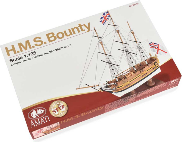 Stavebnica statickej makety historickej lode, AMATI H.M.S. Bounty 1:135 First step kit. Historické lode sú jednými z najobľúbenejších lodných modelov, preto bola vytvorená séria First step kit, ktorá je určená pre začiatočníkov. V sete je hotový drevený trup lode, kýl s výrezmi a drobné príslušenstvo.
