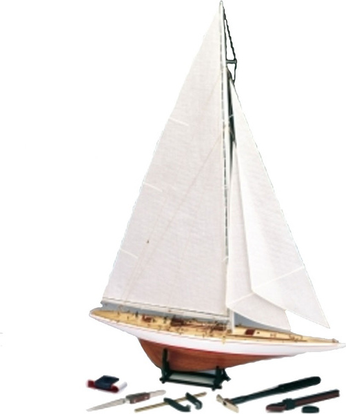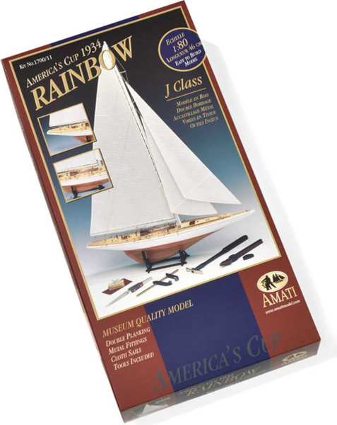 Stavebnica statickej makety historickej lode AMATI Rainbow plachetnica 1934 1:80 kit. Rainbow vyrobil Starling Burgess, aby bránil americké farby v Americkom pohári 1934. Kormidelník bol Harold S. Vanderbilt. Drevené diely ako kýl a obšívka sú rezané laserom, obsiahnuté sú plachty, lanové, doplnky. V balení je aj sada náradia.