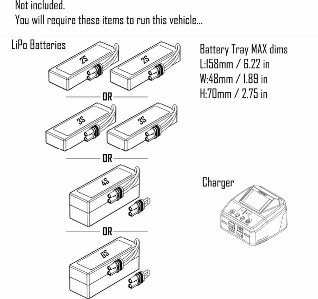 - Pre bežné jazdenie jeden LiPo akumulátor Spektrum 14.8 V 5000 mAh s technológiou Smart, alebo Spektrum G2 14.8 V 5000 mAh s technológiou Smart G2. Vďaka nižšej rýchlosti je toto riešenie vhodné pre deti.