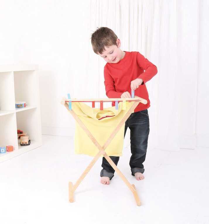 Tento drevený vešiak na bielizeň s pestrofarebnými mohutnými štipcami je ideálnym miestom na sušenie odevov. Či už sa vaša ratolesť chce postarať o vlastnú bielizeň alebo napríklad o oblečenie svojho plyšáka či bábiky, je tu veľa voľného miesta! Zistite viac o tom, čo sa deje pri praní, a rozvíjajte realistické, zábavné herné role.