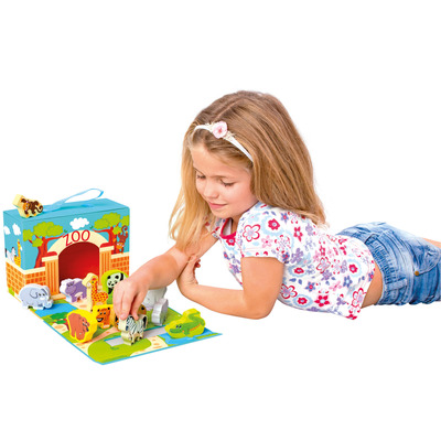 Zoo v kufri, 13 kusov. Kufrík s rôznymi zvieratami zo zoo sa používa na ich uloženie a je vybavený držadlom pre ľahké prenášanie - vhodné aj na cesty. Po otvorení sa jedna strana vyklopí a pôsobí ako hracia plocha.