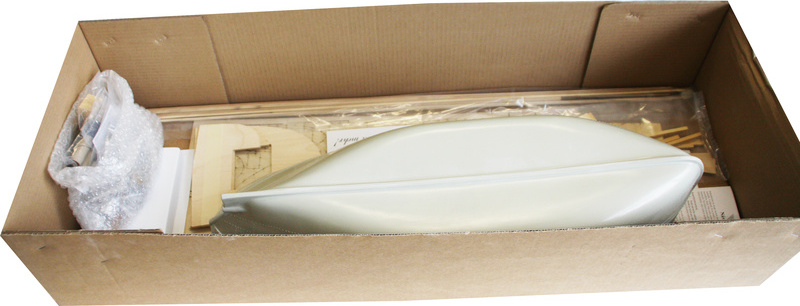 Po otvorení veka krabice nájdete laminátový trup, drevené diely modelu z preglejky, sadu líšt, drobné súčasti uzavreté vo vrecúškach, sadu výkresov a manuál.