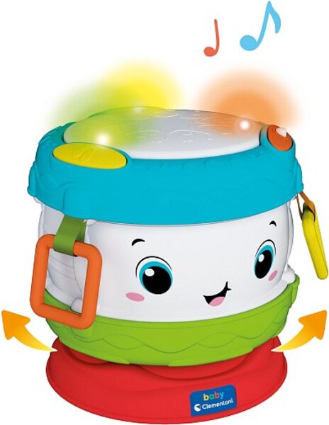 Stlačením tlačidla na ráme bubna môže dieťa počúvať veľa zábavných zvukov a melódií. Rýchlosť hudby sa mení na základe rotácie bubna a vytvára svetelné a zvukové efekty. Poklepaním na hornú časť bubna môže dieťa počúvať mnoho rôznych zábavných zvukov. Vďaka LED svetlám pod hornou časťou pritiahnu výsledné svetelné efekty pozornosť dieťaťa a vzbudia jeho zvedavosť, keď sa hrá s bubnom. Praktické rukoväte sú vyrobené z plastu a majú reliéfne detaily na stimuláciu hmatového prieskumu. Prísavka pod dnom bubna udrží hračku stabilnú, aj keď sa otáča.