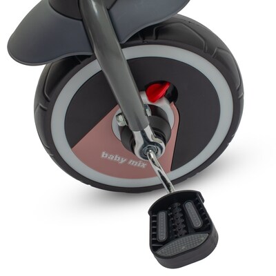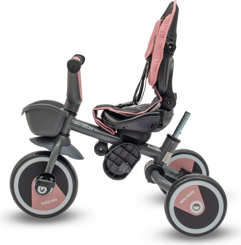 Detská šliapacia trojkolka Baby Mix 5v1 RELAX 365 je multifunkčný dopravný prostriedok a je typickým príkladom produktov GROW UP - rastie zároveň s dieťaťom. Trojkolku môže ovládať ako dieťa, tak aj rodič pomocou nastaviteľnej vodiacej tyče. Po odobratí vodiacej tyče, sklápacej striešky, ktorá chráni pred slnkom, alebo ostatných komponentov bude slúžiť ako trojkolka. Má modernú konštrukciu, pohodlné a ergonomicky tvarované sedadlo, ktoré je posuvné a otočné o 360 stupňov, čo umožní dieťaťu cestovať v smere alebo proti smeru jazdy. Je vyrobená z kvalitných a odolných materiálov a skladacia konštrukcia umožňuje bezproblémovú prepravu trojkolky napríklad v kufri auta. Jej skladanie je veľmi jednoduché, intuitívne a nevyžaduje žiadne náradie.