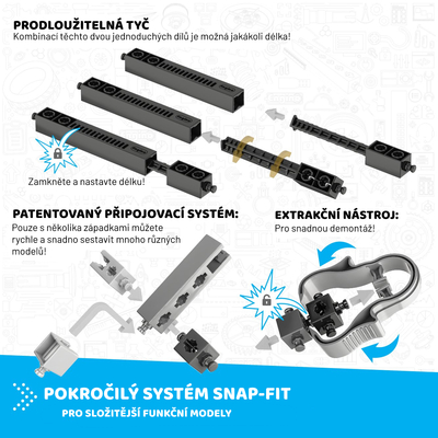 Kreatívna stavebnica Engino, ktorá pomáha rozvíjať myslenie, priestorové videnie a navrhovanie v 3D priestore. Oživte svoje výtvory a sledujte, ako sa pohybujú pomocou motora s prevodovkou s vysokým krútiacim momentom. Postupujte podľa farebného návodu, kde je popísaná časť produktov a zvyšné potom online alebo v 3D aplikácii zdarma na stiahnutie. Zostavujte si aj vlastné výtvory podľa vašej fantázie a pochváľte sa nimi nám alebo svojim priateľom. Celá stavebnica je uložená v plastovom kufríku pre ľahké skladovanie a prenášanie. Jednotlivé diely sa na seba jednoducho nacvakávajú.