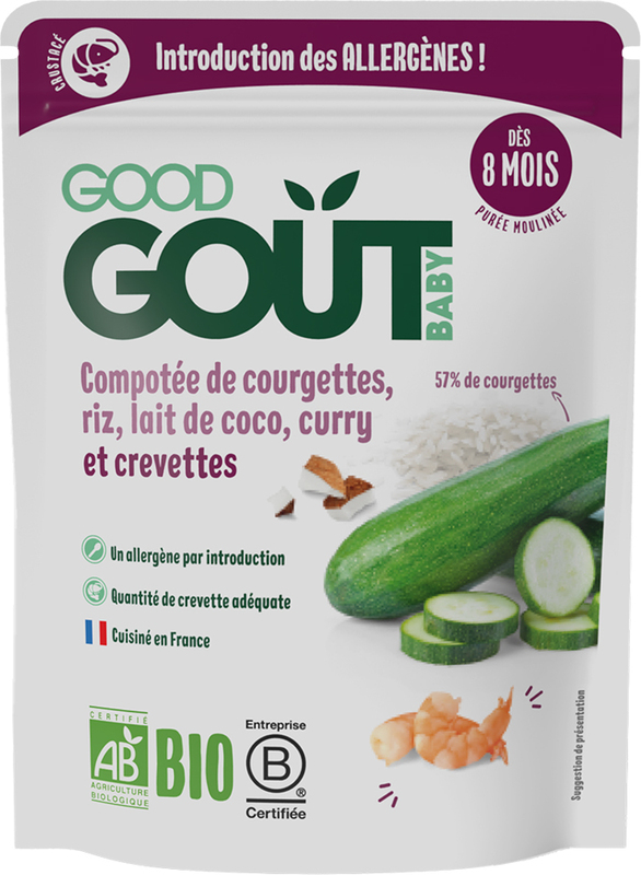 Zloženie: * cukety 57 %, voda z varenia, * biela ryža 10 %, * KREVETY 8 %, * kokosové mlieko (* kokos 65 %, voda) 5 %, * kari 0,15 %. *z ekologického poľnohospodárstva. Môže obsahovať stopy ZELERU. Alergény označené VEĽKÝM písmom.
