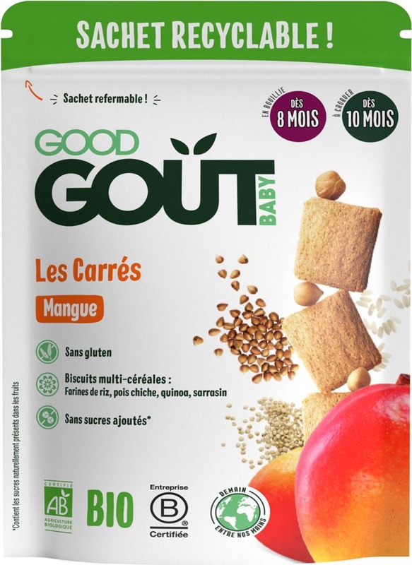 Zloženie: 65 % bio ryžová múka, 10 % bio cícerová múka, 7,5 % bio sušené plnotučné MLIEKO, 6 % bio mangový prášok, 5 % bio quinoová múka, 5 % bio pohánková múka, prírodná aróma, vitamín B1. Bezgluténové. Obsahuje laktózu. Alergény sú označené VEĽKÝM PÍSMOM.