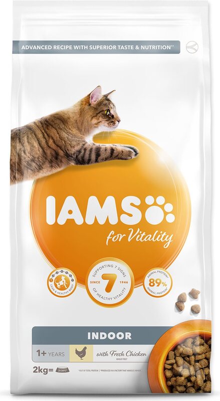 Krmivo IAMS for Vitality pre dospelé mačky a mačacie seniorov žijúce v byte je 100% kompletné a vyvážené, odborníkmi zostavené krmivo, ktoré bude vášmu zvieraťu chutiť a svedčiť. Naša nová a vylepšená receptúra s čerstvým kuracím mäsom je založená na kvalitných živočíšnych bielkovinách starostlivo vybraných tak, aby podporovali sedem znakov zdravej vitality mačky. Aby boli mačky zdravé, aktívne a plné energie, obsahujú naše lahodné receptúry až 89 % živočíšnych bielkovín (z celkového obsahu bielkovín). Naša receptúra pre mačky chované v byte dokonale prispieva k zachovaniu štíhlej a zdravej telesnej stavby. Našim záväzkom je ponúknuť mačkám špecializované krmivo so skvelou chuťou, ktoré si váš domáci maznáčik bezvýhradne zamiluje a ktoré bude podporovať všetkých sedem znakov zdravej vitality. Oproti nášmu bežnému krmivu IAMS pre dospelé mačky s čerstvým kuracím mäsom obsahuje táto receptúra o 14% menej tuku na zachovanie štíhlej telesnej stavby a zdravej kondície. Vďaka vyváženému obsahu omega-3 a omega-6 mastných kyselín v krmive IAMS budete môcť obdivovať zdravú kožu a lesklú srsť svojho zvieraťa. Svoje receptúry sme vyvinuli tak, aby znižovali pH v močovej sústave a udržali ju zdravú. Pripravte sa, že vaša mačka bude skákať a vyčíňať. To vďaka kvalitným bielkovinám a nevyhnutným minerálom, ktoré pomáhajú udržať zdravé svaly a kosti. Kombinácia antioxidantov s vitamínom E posilňuje imunitu, takže ju už pri výpravách nič neohrozí. A keď ju budete počuť chrúmať naše granule s vyváženým obsahom minerálov v každom súste, môžete si byť istí, že bude mať silné a zdravé zuby. Pri upratovaní mačacej toalety oceníte zdravé trávenie mačky vďaka optimálnej kombinácii vlákniny, prebiotík a repnej dužiny. Naše krmivá navyše obsahujú základné živiny, ako napr. taurín, pre zdravé srdce, aby vám váš miláčik nikdy neprestal prejavovať lásku. Krmivo IAMS podporuje sedem znakov zdravej vitality, ktoré na svojom zvierati budete s radosťou pozorovať každý deň. Kŕmny návod: viď tabuľka na obale.