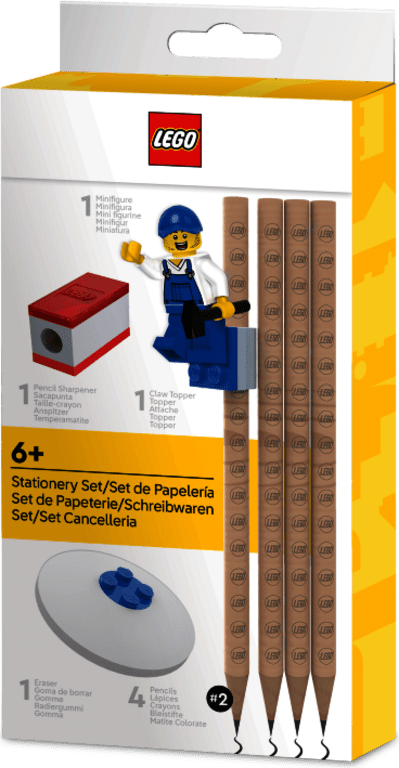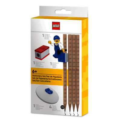 Set s klasickým LEGO motívom obsahuje 1 minifigúrku, 4 grafitové ceruzky, 1 LEGO klip na uchytenie ceruzky, strúhadlo a gumu na gumovanie.