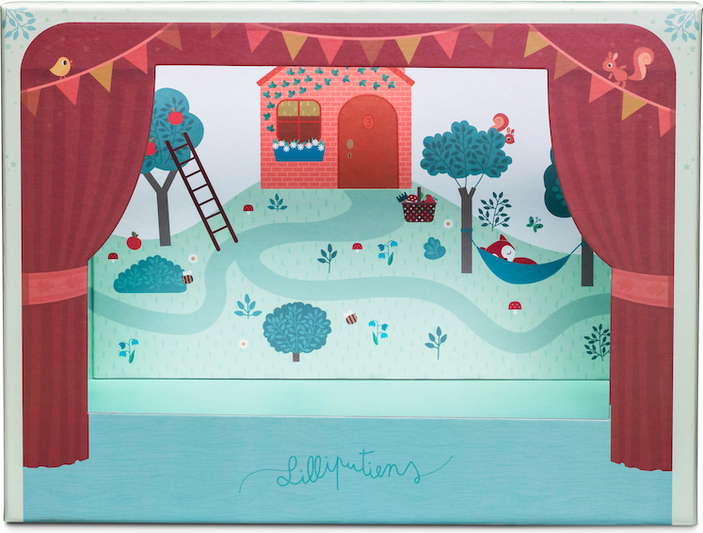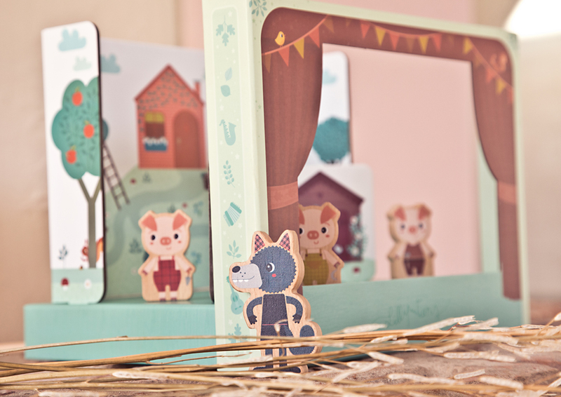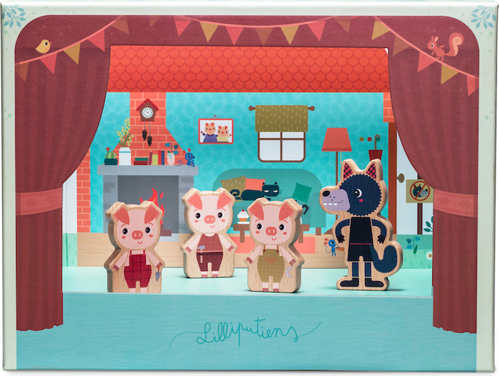 Pomocou divadla môžete deťom zahrať rozprávku O troch prasiatkach. Drevené postavičky sa na javisku, medzi krásne ilustrovanými dekoráciami, pohybujú vďaka 2 dreveným tyčkám vybaveným magnetom. Škatuľa sa behom okamihu premení na divadlo.