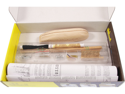 Po otvorení viečka krabice nájdete drevené diely modelu, drobné súčasti uzavreté v plastovom priehľadnom blistri a sadu výkresov.