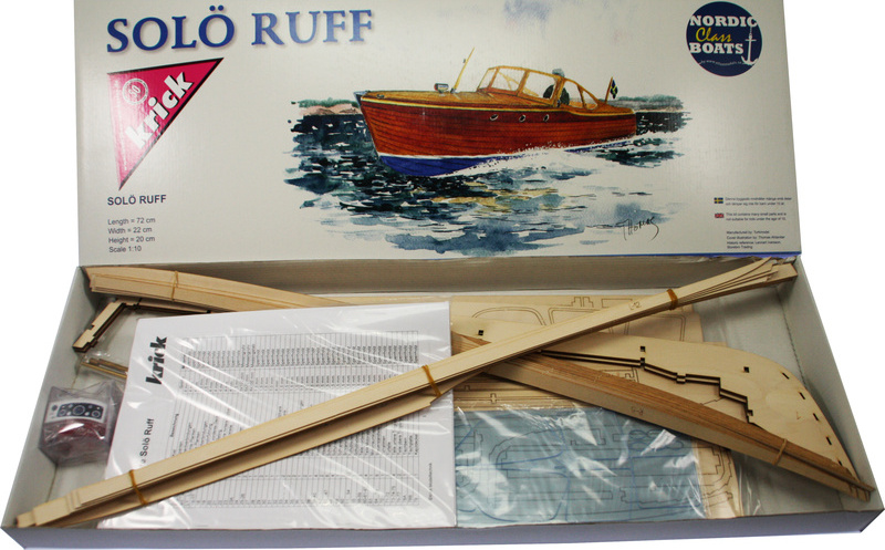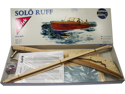 Stavebnica modelu lode Nordic Claas Boats Solö Ruff Daycruiser v mierke 1:10, vzor je z roku 1965. Model je dlhý 720mm a je možné ho zostaviť ako neplávajúcu statickú maketu, alebo ho môžete osadiť vlastnou RC výbavou a vypustiť na hladinu.