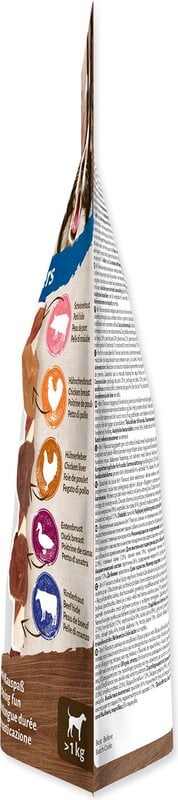 Zloženie: mäso a vedľajšie produkty živočíšneho pôvodu (23% hovädzej kože, 20% kuracích pŕs, 17% bravčovej kože, 13% kačacích pŕs, 4% kuracej pečene), vedľajšie produkty rastlinného pôvodu, minerálne látky.