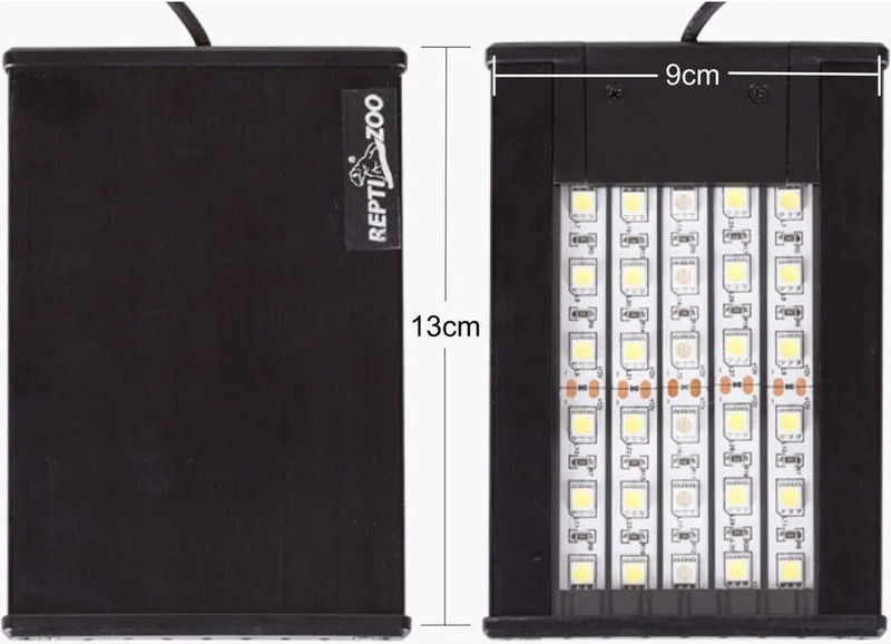 Lampa je vybavená hliníkovým telom, ktoré slúži ako efektívny chladič, čím zabraňuje prehrievaniu diód a predlžuje ich funkčnosť. Súčasťou konštrukcie je otočný kĺb, ktorý umožňuje presné nasmerovanie svetelného lúča tam, kde je to v teráriu najviac potrebné. Spektrum svetla je optimalizované pre prirodzený rast rastlín a verné podanie farieb živočíchov. Inštalácia je veľmi jednoduchá vďaka univerzálnemu závitu E27, ktorý pasuje do väčšiny štandardných terarijných krytov a lámp.