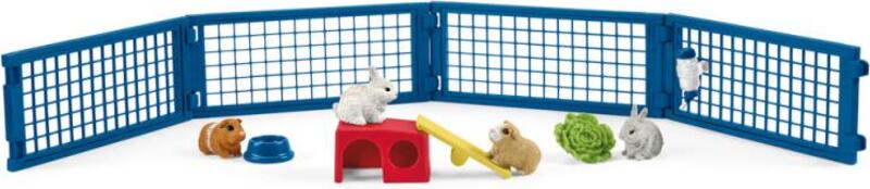 S králiky a morčatami z farmy Schleich® Farm World je stále čo objavovať. Zvieratá sa schovávajú vo svojom koterci, sajú z fľaše na pitie, okusujú šalát alebo prebiehajú cez hojdací hračku, ktorá tiež slúži ako praktická rampa, na lezenie alebo preskakovanie na strechu svojho koterca. Dieliky plotov možno ľubovoľne spájať alebo kombinovať s inými ploty Schleich®. Schleich® figúrky sú všetky modelované v najjemnejšom detaile, láskyplne maľované a povzbudzujú deti k tomu, aby hrali a zároveň sa učili.Obsahuje: 2x morča, 2x králik, 1x koterec, 1x hojdačka, 1x miska, 1x fľašu s vodou, 1x šalát, 5x plot.