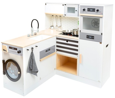 Vďaka svojmu stavebnicovému systému je možné zostaviť ako rohovú kuchyňu, alebo kuchynskú linku s fungujúcim ostrovčekom, ponúka tak veľa priestoru a možností aj pre hru viacerých detí naraz. Otočné gombíky cvakajú a varná doska s batériovo napájaným (batérie nie sú súčasťou balenia) svetlom a zvukom zaručujú realistické potešenie z hry. Skrinky zaisťujú dostatok úložného priestoru a sú vybavené dvierkami.