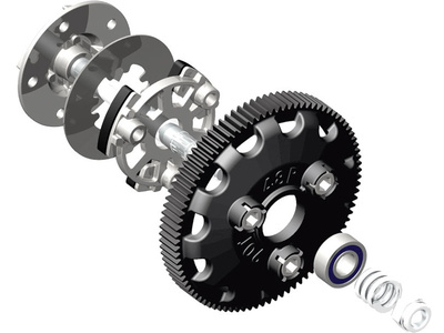Převodovka, disková spojka a planetový diferenciál sú uzavreté do jedného kompaktného celku. Převodovka s trecou spojkou spoľahlivo prenáša výkon motora na nápravy, planetová prevodovka diferenciálu Magnum 272™ má ozubené kolesá vyrobené z kalenej ocele. Tento systém vyžaduje absolútne minimálnu údržbu. K dispozícii sú pastorky a ozubené kolesá s rôznymi počtami zubov, takže si môžete model presne vyladiť pre rýchlostné aj technické trate.