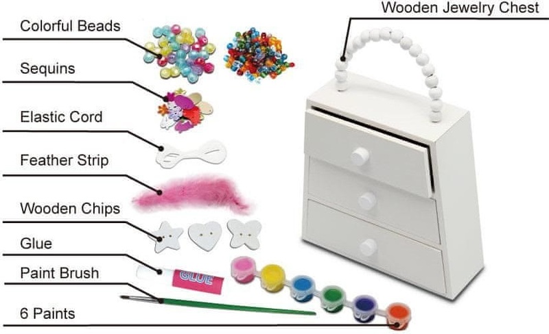 drevenú šperkovnicu, štetec, 6 farieb, šnúrku, lepidlo, farebné korálky a ďalšie ozdoby