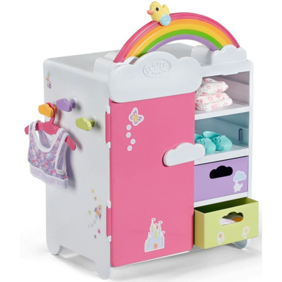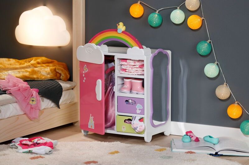 S dúhovou šatníkovou skriňou BABY born je prezliekanie skvelá zábava! Keď je kačička Berta tlačená po dúhe, dúha sa rozsvieti. Berta hrá pri vyberaní outfitu veselú melódiu, ktorá jej dodáva dobrú náladu. Vďaka šatníkovej tyči, poličkám a zásuvkám je v skrini dostatok miesta na oblečenie pre bábiky. Kabelky alebo iné veci na zavesenie je možné zavesiť na roztomilé háčiky v tvare obláčikov na vonkajšej strane skrine. Kompletný outfit BABY born môžete obdivovať vo veľkom zrkadle. Samotnú šatníkovú skriňu možno pomocou archu samolepiek ešte viac vyzdobiť.